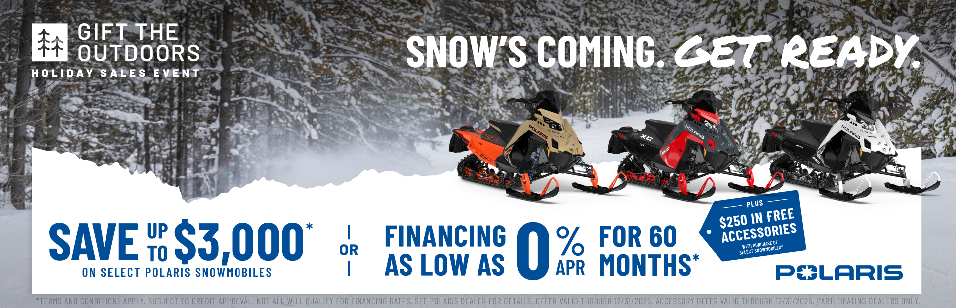 **Promotional finance offers (rates as low as 0.00% for 60 months) valid on only select new 2024-2025 model Polaris snowmobiles purchased from participating authorized U.S. Polaris Snowmobile dealers between 01/11/2025 – 31/12/2025. Minimum payments required. Offer may not be combined with certain other offers, is subject to change and may be extended or terminated without further notice. Model specifications subject to change. Model & year exclusions apply. See your local dealer for details. This special finance offer is in lieu of any rebate offers.